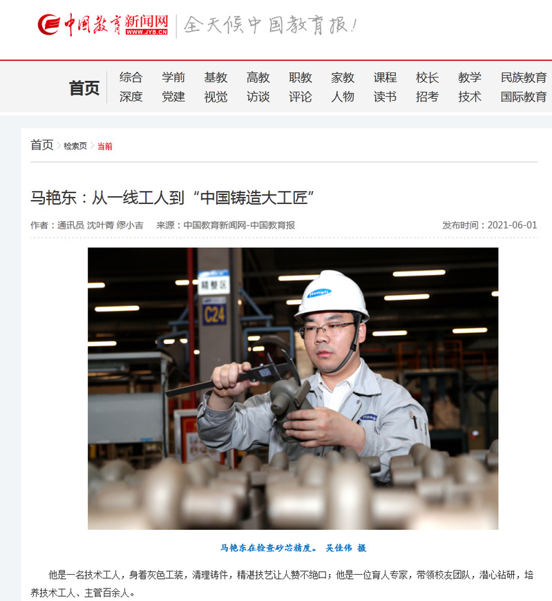 中国教育新闻网-马艳东:从一线工人到“中国铸造大工匠”