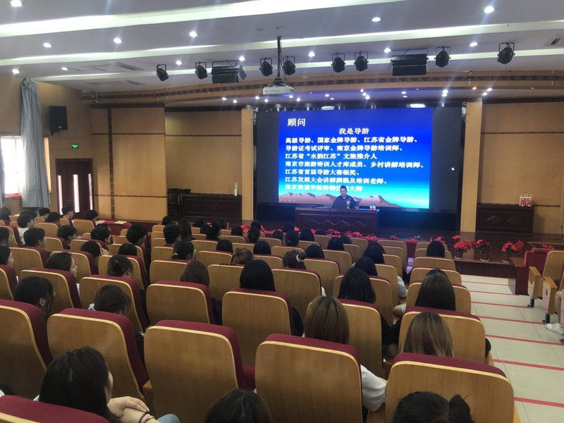 顾问给学生带来主题为“小导游、大情怀”的讲座。讲座涵盖了带团心得、导游词的讲解、带团的有趣故事、比赛心得、执业感悟等内容。在进行现场演示讲解时,顾问还讲述了导游人员丰富自己的知识储量的重要性。顾老师将近二十年的旅游从业经验被浓缩进两个小时的讲座中,由浅入深,由点及面,通俗易懂,妙语连珠,让学生真切地感受到导游工作可以带给游客的欢乐,更让学生对这位依然活跃在导游工作一线的前辈心生敬佩。
