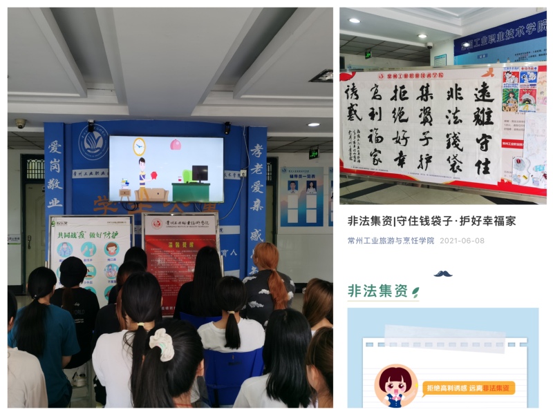 此次活动结合学生特点,多形式、多途径开展。线下,学院征集防范非法集资的书画作品,在学生公寓及学院宣传栏进行展示宣传,切实提高学生的防范意识。同时,结合宣传栏、微信公众号、微博、qq群等线上宣传阵地进行教育宣传,普及非法集资的基本概念、表现形式、主要危害及防范方法。在学生公寓,公共电视循环播放防范非法集资宣传片,引导学生充分认识到非法集资的社会危害,自觉鉴别和远离非法集资。