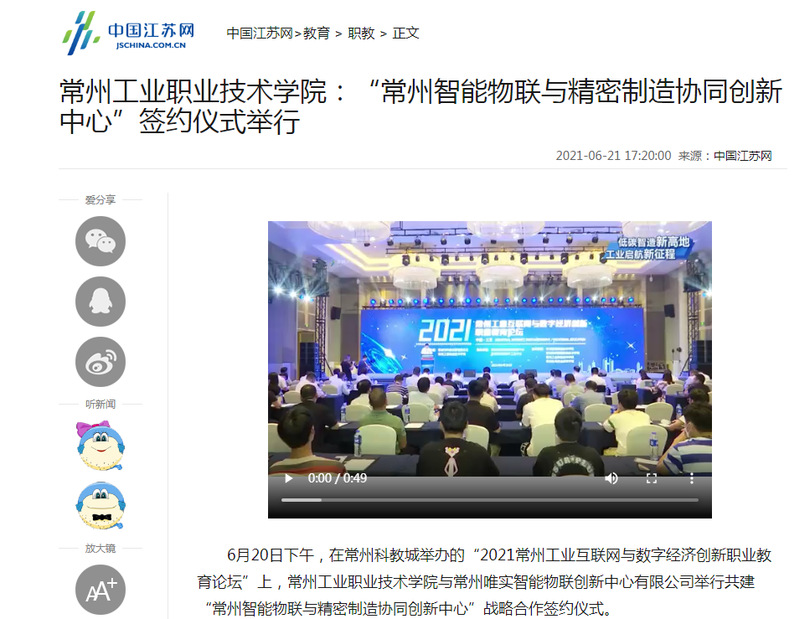 中国江苏网-常州工业职业技术学院:“常州智能物联与精密制造协同创新中心”签约仪式举行