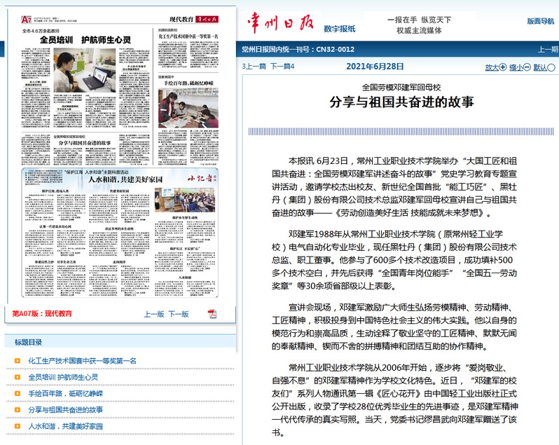 常州日报-全国劳模邓建军回母校分享与祖国共奋进的故事