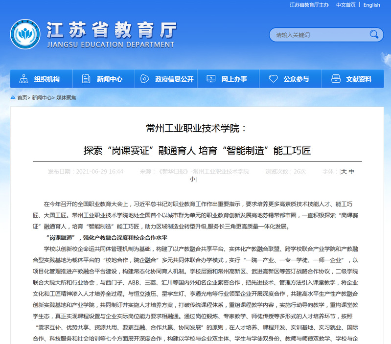 江苏省教育厅-常州工业职业技术学院: 探索“岗课赛证”融通育人 培育“智能制造”能工巧匠