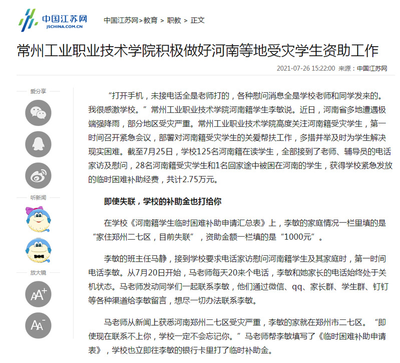 中国江苏网-常州工业职业技术学院积极做好河南等地受灾学生资助工作