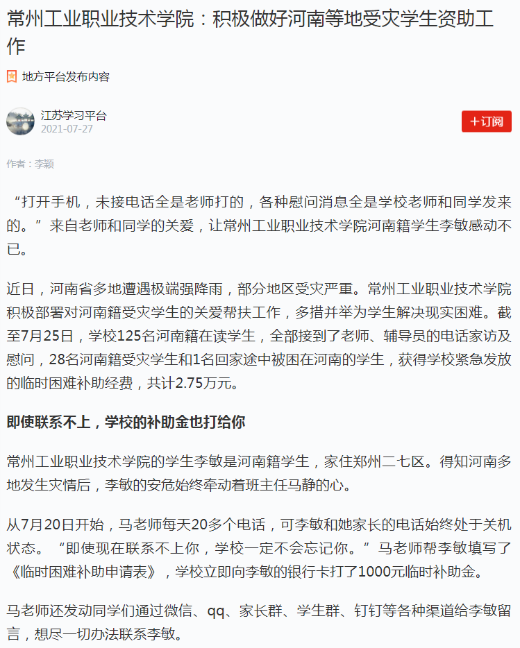 学习强国-常州工业职业技术学院:积极做好河南等地受灾学生资助工作