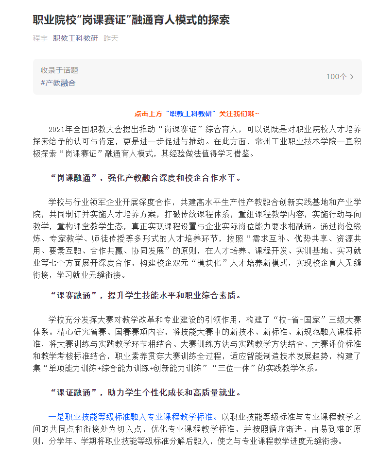 职教工科教研-职业院校“岗课赛证”融通育人模式的探索