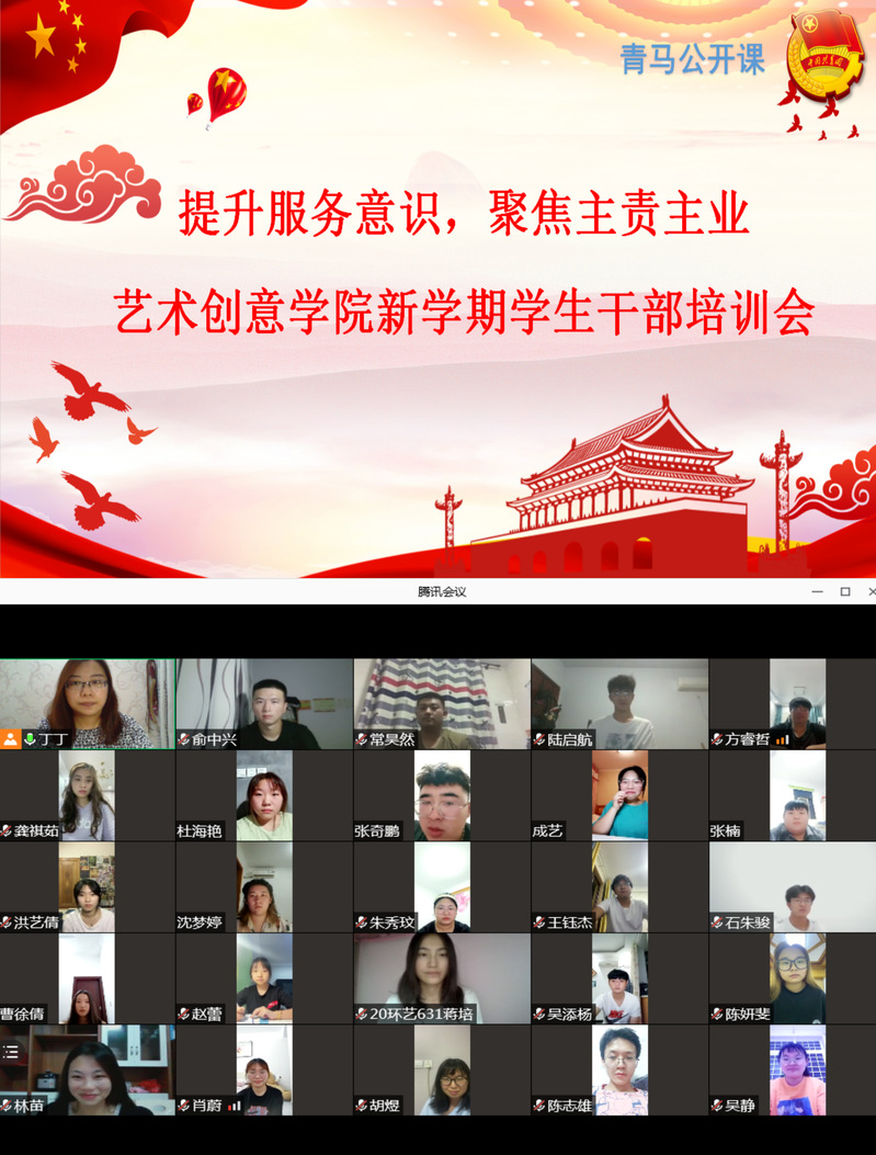 为了进一步加强学生干部队伍建设,提升学生干部素质,切实打造一支全心全意为同学服务的学生组织,9月6日晚,艺术创意学院团委通过线上会议的方式继续开展新学期青马工程学生干部培训。本次培训会的主题为“提升服务意识,聚焦主责主业”,培训由艺术创意学院分团委书记丁洁主讲,全体学生干部参加了本次会议。