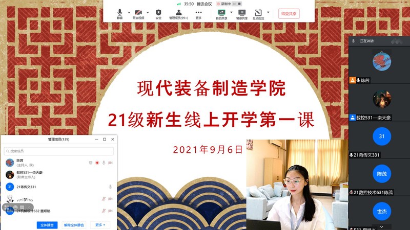 在疫情防控背景下,为更好地协助2021级新生完成线上入学报道等相关工作,9月6日,现代装备制造学院辅导员陈茜组织本班学生开展21级新生“线上开学第一课”,针对开学相关事宜进行说明和解释。本次班会由陈茜主持, 155名2021级新生参加会议。