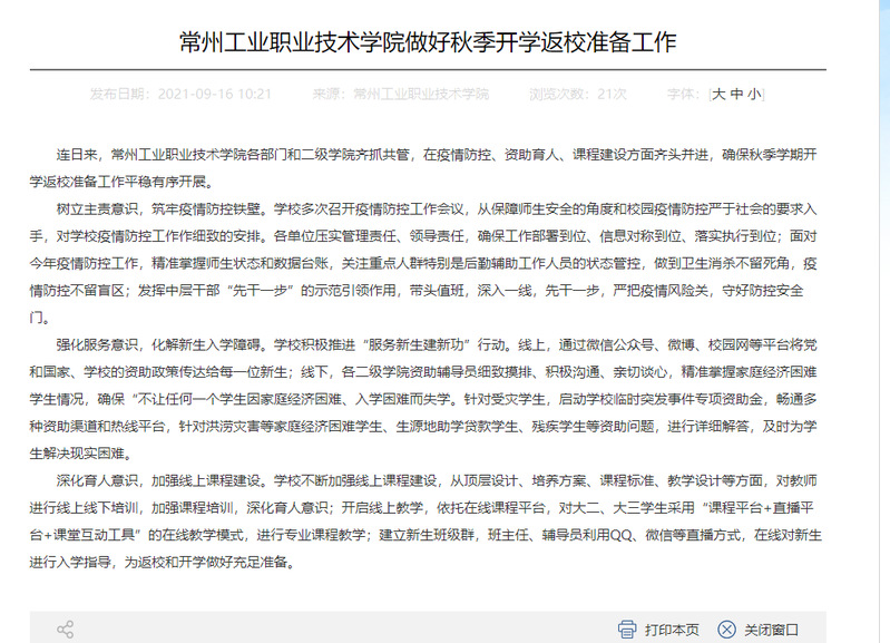江苏省教育厅-常州工业职业技术学院做好秋季开学返校准备工作