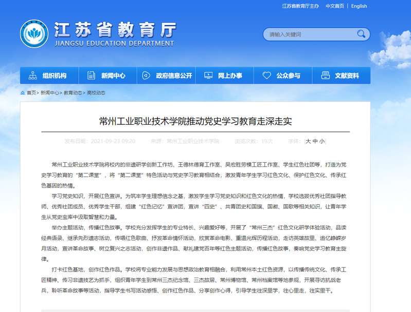 江苏省教育厅-常州工业职业技术学院推动党史学习教育走深走实