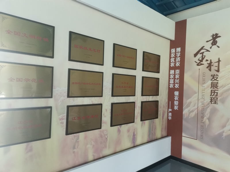 汽车驶入村里,路边的两层小洋房格外引人注目,房前房后种满花草树木,道路整洁干净,活脱脱一幅美丽乡村的景象。我们走进黄金村党群服务中心,一进村支部会议室,各种荣誉牌匾和锦旗顿时映入眼帘,比如“全国文明村镇”“全国一村一品示范村”“江苏省生态村”“江苏省民主法治示范村”等。座谈会上,我们与黄金村党总支成员共同观看黄金村宣传片,就黄金村的发展致富之路进行对话交流。