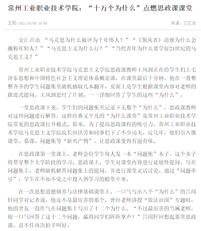 交汇点-常州工业职业技术学院:“十万个为什么”点燃思政课课堂