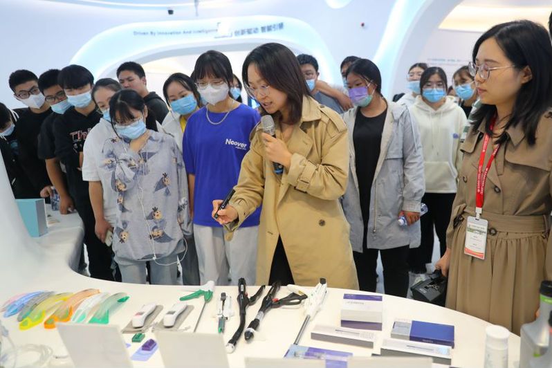一点半,一行人来到了薛家镇,开始了今天的参观。首先参观了生命健康产业园区展厅,展厅中陈列了薛家镇大大小小的企业产品,随着解说员的介绍,同学们也兴趣满满,好奇的大量着高科技生产设备、琳琅满目的药品等。