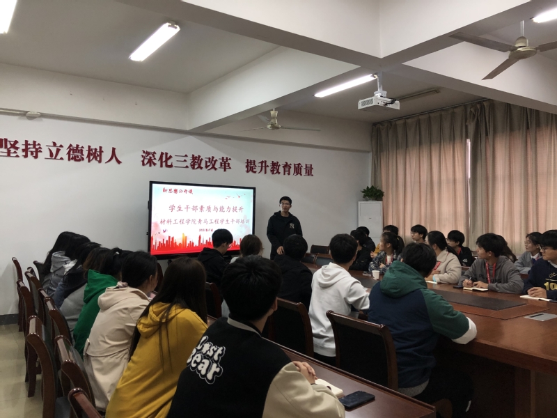为进一步增强学生干部综合素质,提高团委学生会整体工作和服务水平,更好地服务于学院发展,11月18日,材料工程学院团委开展“学生干部的素质与能力提升”青马工程学生干部培训,学院学生会主席张宇主讲,团委学生会全体学生干部参加了本次培训。