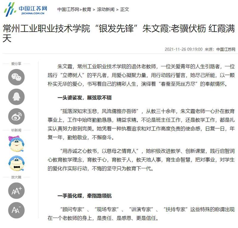 中国江苏网-常州工业职业技术学院“银发先锋”朱文霞:老骥伏枥 红霞满天