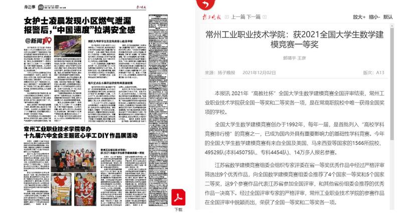 扬子晚报-常州工业职业技术学院:获2021全国大学生数学建模竞赛一等奖