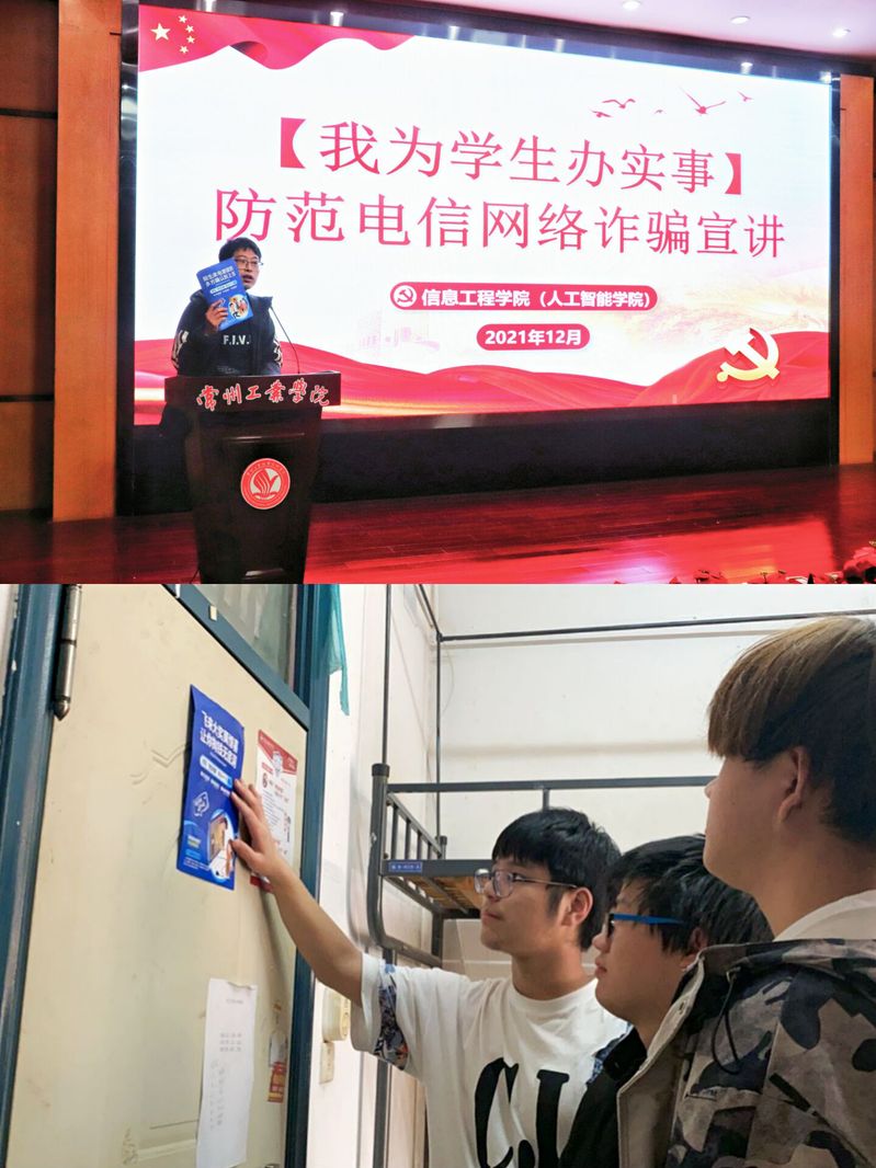 此外,信息工程学院还结合信息网络,通过及时在班级群转发反诈知识和身边典型案例,播放解析电信诈骗案例的短片等多种方式,开展反诈宣传工作,力求达到“线上线下处处有提醒,常见诈骗手段人人能识别”的效果。从而使广大学生对电信网络诈骗有更深刻的认识,提高反诈意识,更加入脑入心,提醒同学们绷紧防范之弦,远离诈骗之害。
