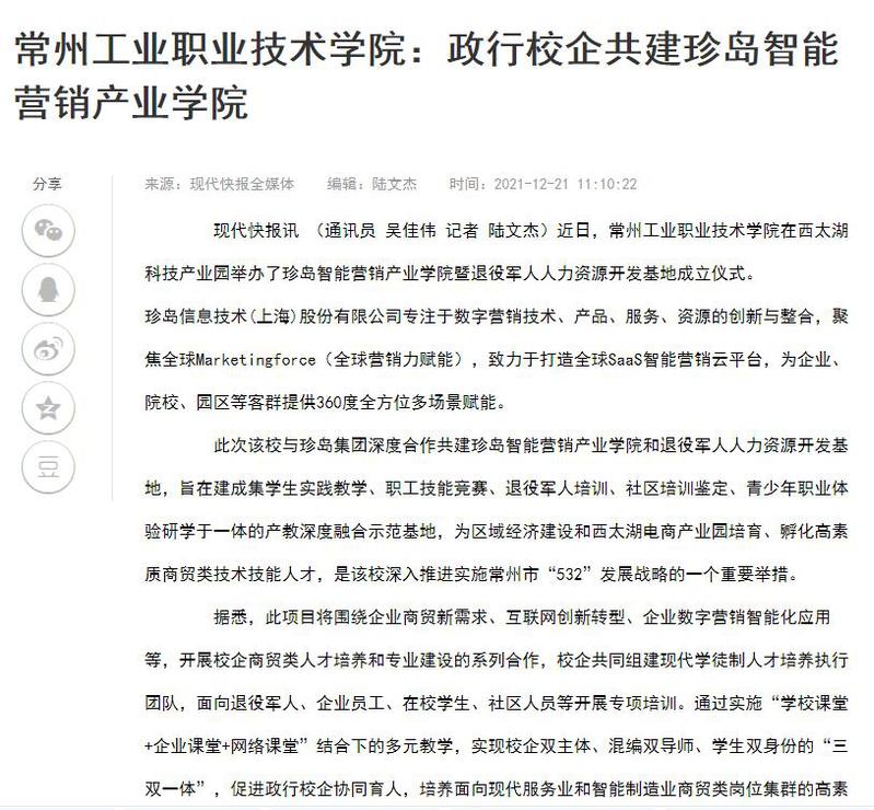 现代快报全媒体-常州工业职业技术学院:政行校企共建珍岛智能营销产业学院