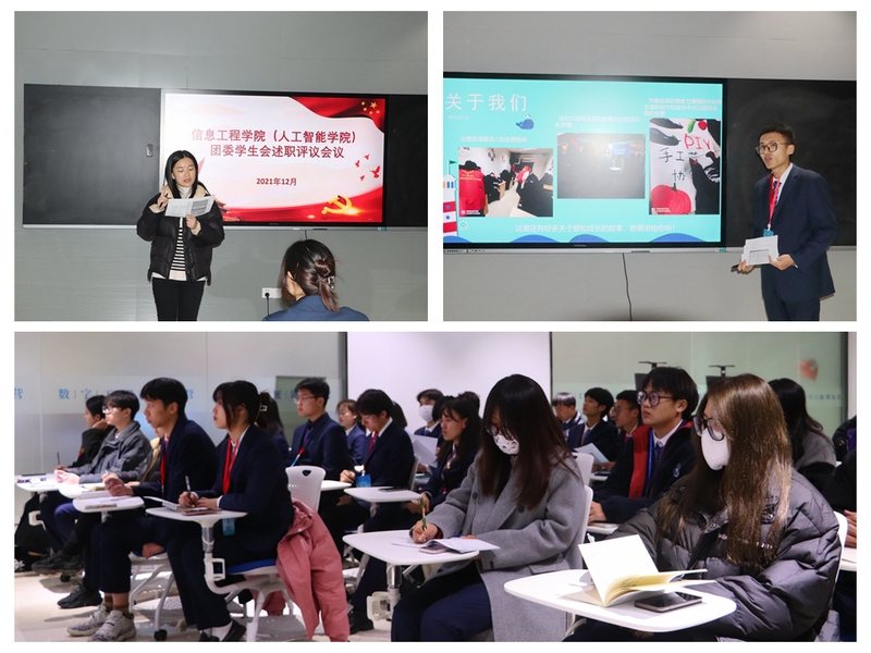 为进一步贯彻落实十九届六中全会精神和党的群团工作会议精神,结合党史学习教育,持续深化共青团改革,提高对学生干部的规范、科学管理,增强团委学生会工作的透明度,进一步做好信息工程学院团学工作全面总结,12月24日,信息工程学院团委成功召开了2021年度学生干部述职评议暨2022年团学工作动员大会。信息工程学院分团委书记姜婉及信息工程学院团委学生会全体成员参加会议。