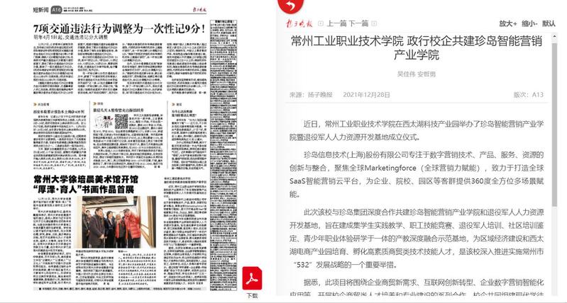 扬子晚报-常州工业职业技术学院 政行校企共建珍岛智能营销产业学院