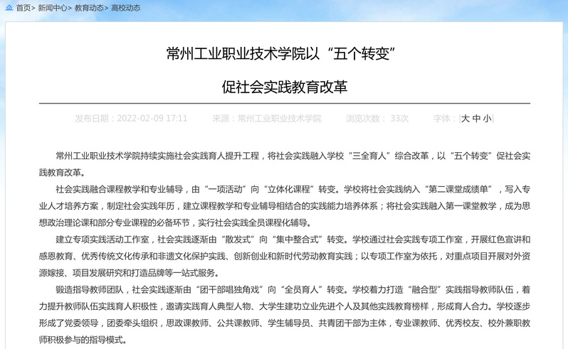 江苏省教育厅-常州工业职业技术学院以“五个转变” 促社会实践教育改革