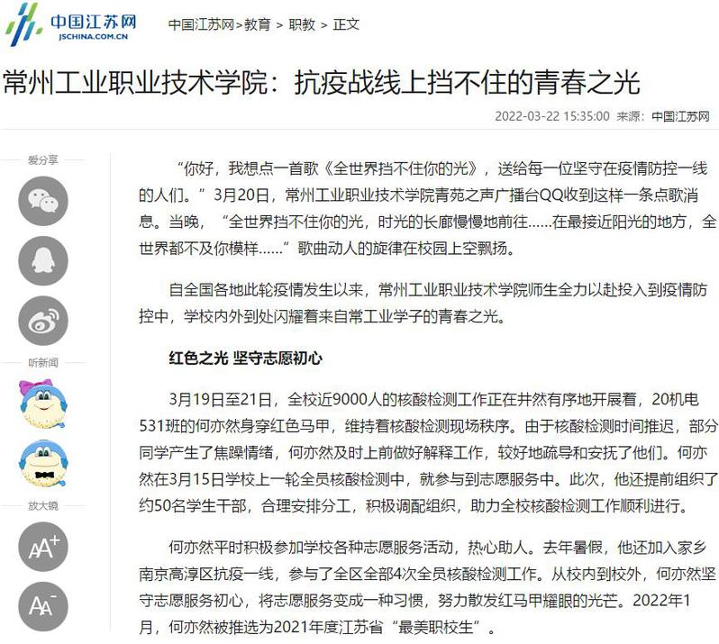 中国江苏网-常州工业职业技术学院:抗疫战线上挡不住的青春之光