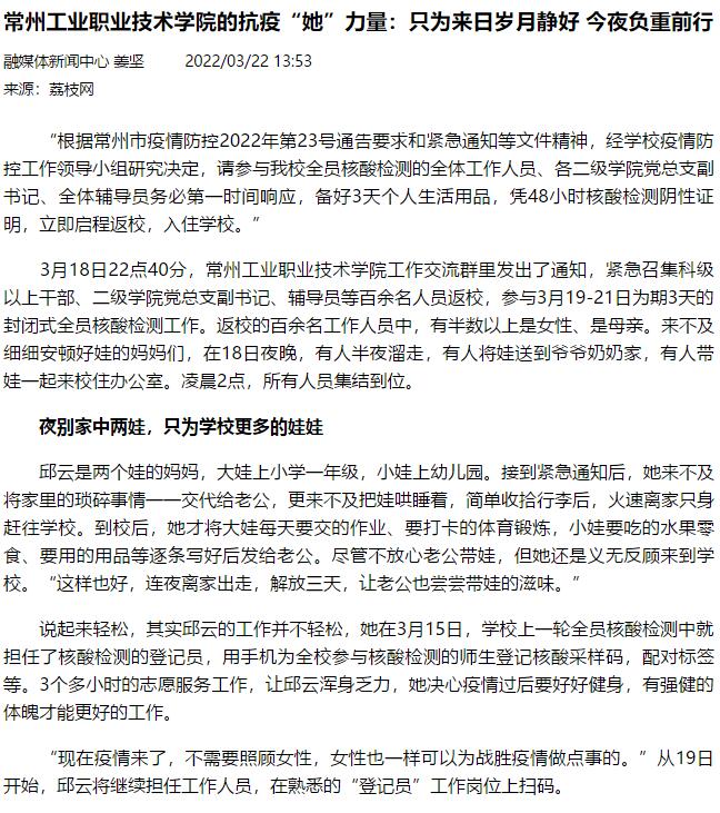 荔枝网-常州工业职业技术学院的抗疫“她”力量:只为来日岁月静好 今夜负重前行