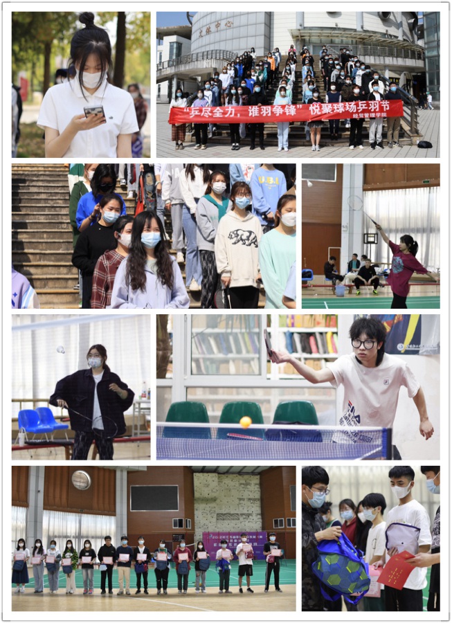 举办“乒尽全力,谁羽争锋”悦聚球场乒羽节。活动开始后学校文体中心充盈着“运动气息”,在严格遵守学校疫情防控要求的前提下,同学们用自己的实际行动在校园里构筑起一道校园青春风景线。百舸争流,奋楫者先;中流击水,勇进者胜,这是比赛中同学们最真实的写照。一道道交错纵横的身影,一阵阵清脆交互的响声,一声声助威呐喊的鼓励,充分展示出了经管学子的高水平、高能力、高素质。本次比赛分为男女单人组,经过两天的激烈角逐,20会计331普晶、20会计331高晶晶、21会计331顾筱晗夺得乒乓球女子组前三名;20商务631孙伟翔、21金融331饶佳旺、21商务331黄泽健夺得乒乓球男子组前三名;21营销661苏婷、20会计331徐晶晶、21物流332朱梦夺得女子组羽毛球前三名;20物流331田茂康、21会计631尹基茏、21营销661顾贺夺得男子组羽毛球前三名。