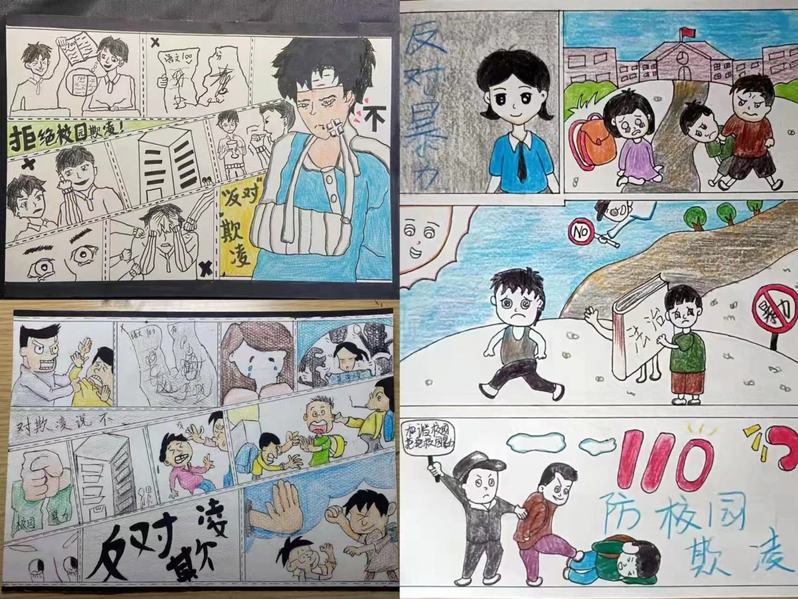 制作宣传漫画。幽默讽刺又生动形象的艺术作品增强了同学们的法治观念,使同学们对“校园欺凌”有了更深入的认识,从而进一步规范自己的行为。见到“校园欺凌”现象,要勇于制止,帮助同学及时改正错误。