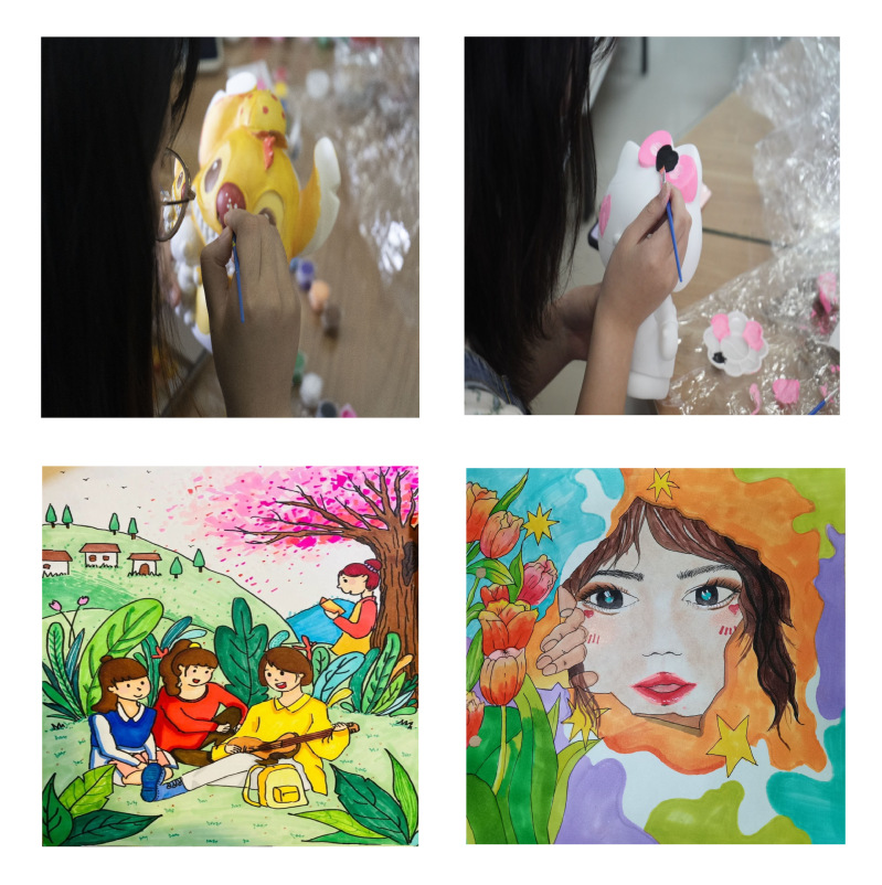 彩绘石膏娃娃,做好心理调适。根据报名情况将大家分成了十五个小组,共同参与石膏娃娃涂色体验活动。随着自由绘制正式开始,学生们迫不及待拿起画笔,一涂一画,给石膏娃娃的脑袋、鼻子、眼睛……一步步地上色,渐渐地让手中的白胚“活”了过来。现场作品风格各异,不同的色彩搭配也产生了不同的视觉效果和心灵感受,有“哪吒”“史迪仔”“双子星”“蜘蛛侠”“Hello Kitty”等。