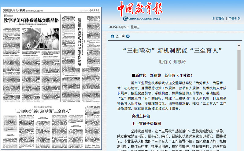 中国教育报-常州工业职业技术学院 “三轴联动”新机制赋能“三全育人”