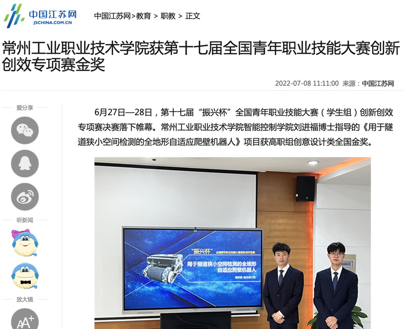 中国江苏网-常州工业职业技术学院获第十七届全国青年职业技能大赛创新创效专项赛金奖
