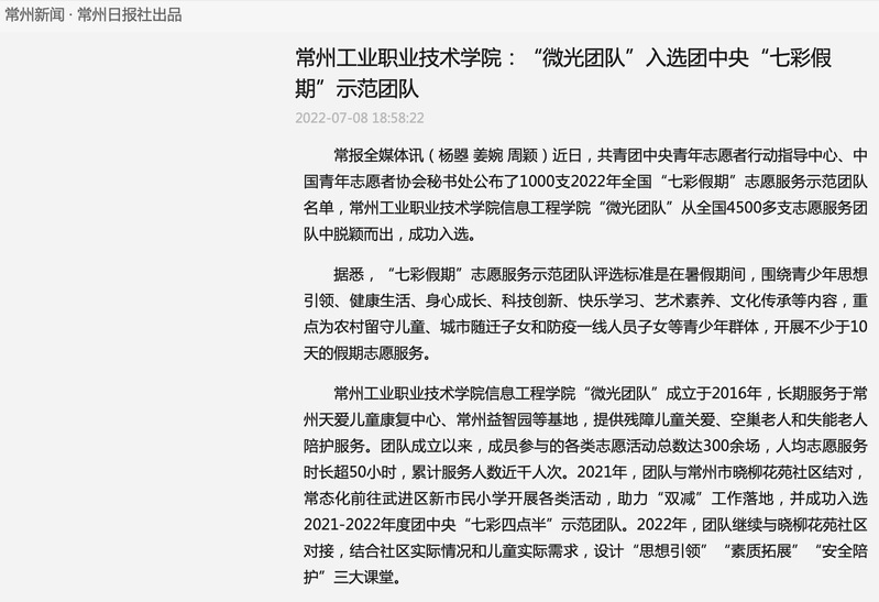 常州新闻-常州工业职业技术学院:“微光团队”入选团中央“七彩假期”示范团队
