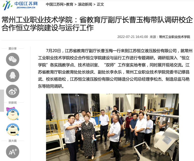 中国江苏网-常州工业职业技术学院:省教育厅副厅长曹玉梅带队调研校企合作恒立学院建设与运行工作