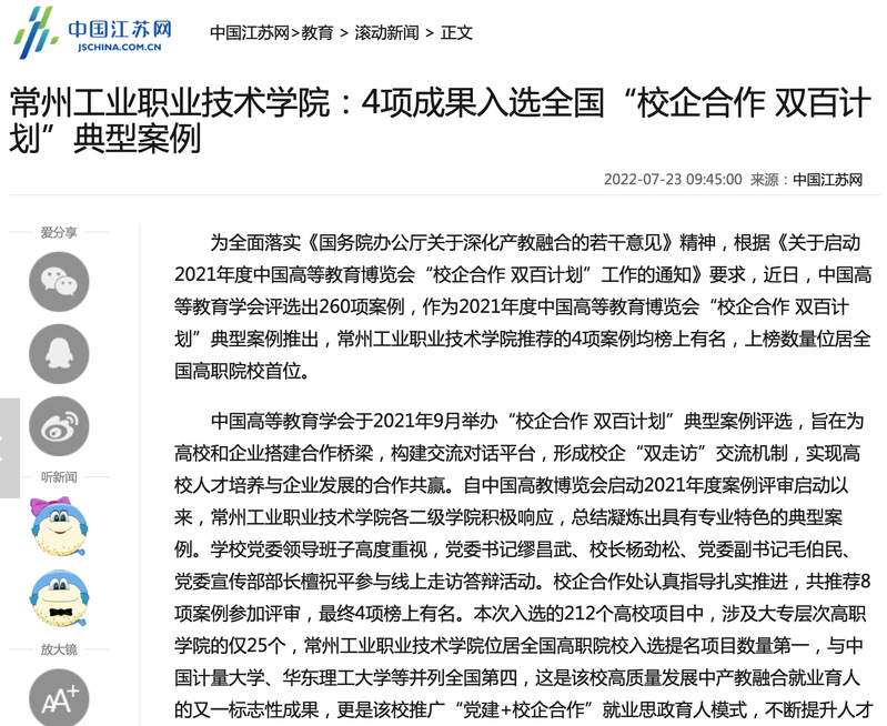 中国江苏网-常州工业职业技术学院:4项成果入选全国“校企合作 双百计划”典型案例