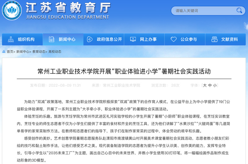 江苏省教育厅-常州工业职业技术学院开展“职业体验进小学”暑期社会实践活动