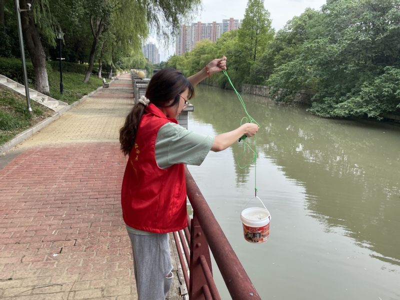 采水样。为探明目前湖塘河水质现状及雨水口排污对湖塘河的影响,团队成员将水质监测点从南到北均匀地布置在红旗桥、大庆桥、大囍桥及湖塘河枢纽处,通过分层采水器采集水样,利用便携式检测仪得到湖塘河中段pH和溶解氧,利用定量采样桶采集南甸苑、城中花苑、花东二村雨水管出口的水质样品。活动真正将课堂及校企“工学交替”等教学环节中所学的环境监测理论应用到实践活动任务当中,团队成员的实际操作技能得到了极大提升。