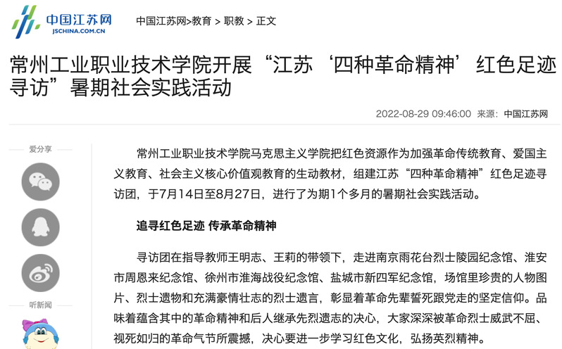 中国江苏网-常州工业职业技术学院开展“江苏‘四种革命精神’红色足迹寻访”暑期社会实践活动