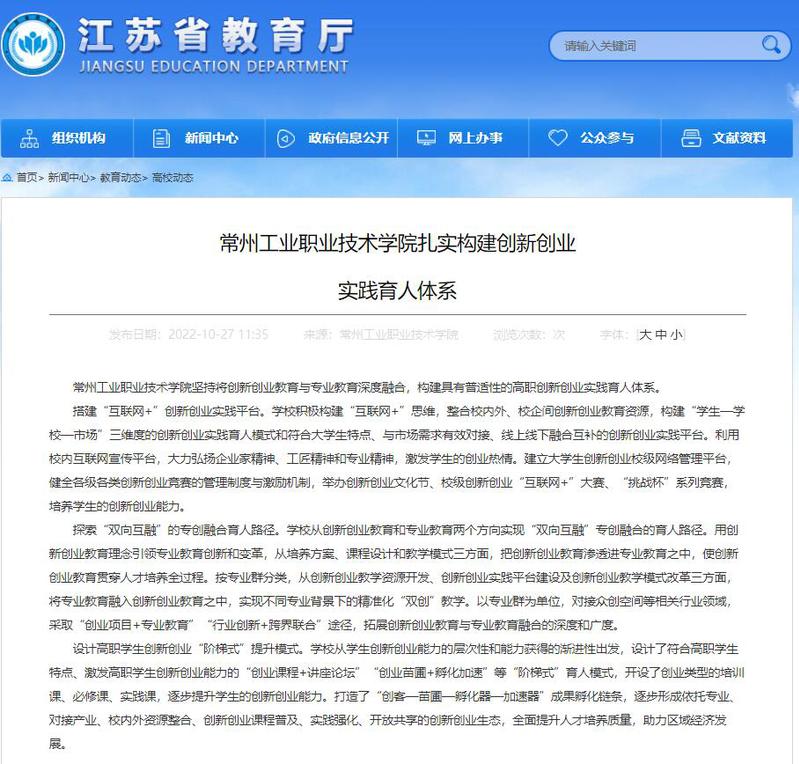江苏省教育厅-常州工业职业技术学院扎实构建创新创业 实践育人体系