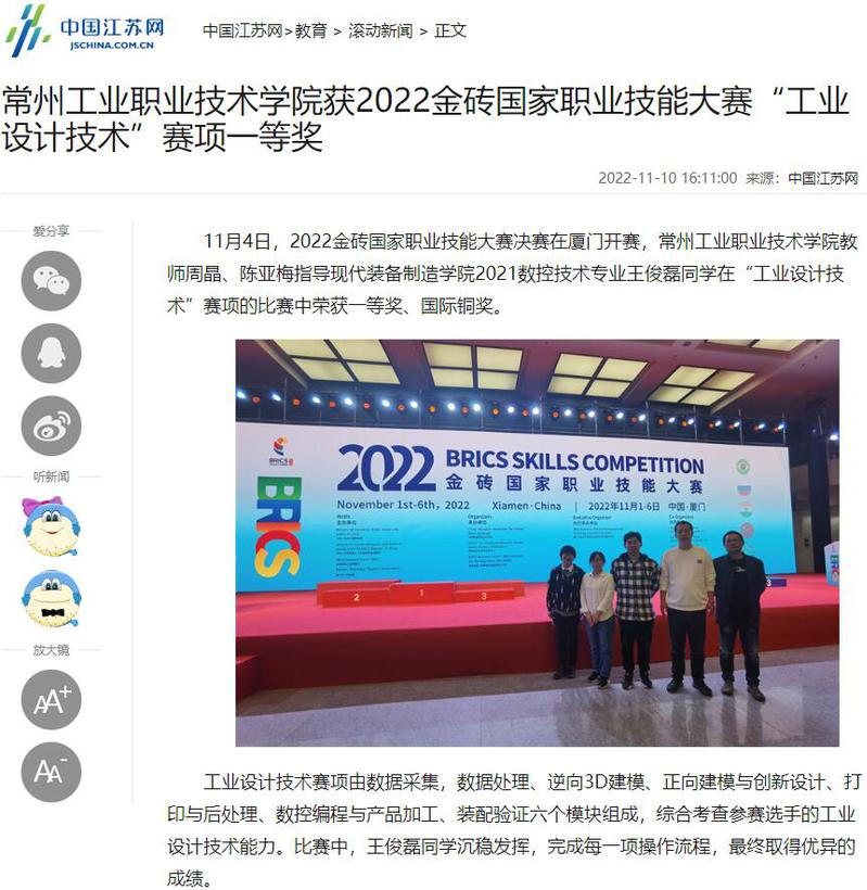 中国江苏网-常州工业职业技术学院获2022金砖国家职业技能大赛“工业设计技术”赛项一等奖