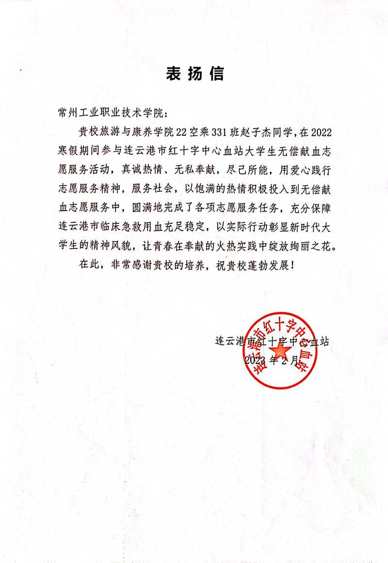 由丁伟轩、张政、郝家欣、赵子杰等同学组建的“大学生无偿献血志愿活动服务实践团”在连云港参与志愿献血服务,受到当地政府的来信表扬产,他们的事迹在连云港市中心血站微信公众号上宣传,进一步激发青年学子的志愿服务精神。赵子杰表示:“在参加无偿献血志愿服务工作的同时,我进行了人生中的第一次献血。说实话,第一次献血还是有点紧张的,心里还是有一点点害怕的,但一想到我的血液可能挽救一名生死攸关的人,内心非常激动,也感觉非常的有意义。我的志愿者累计时长达22个小时,以后我将继续努力帮助更多需要的人。”