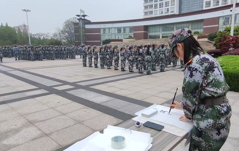 恰逢国防安全日,五十七连陈仪同学在军训场上挥墨写下“国家安全日”、“全民反诈”、“维护国家安全,构建和谐社会”等宣传标语,以实际行动书写铿锵誓言,倡导青年增强国家安全意识,筑牢国家安全防线。