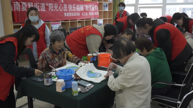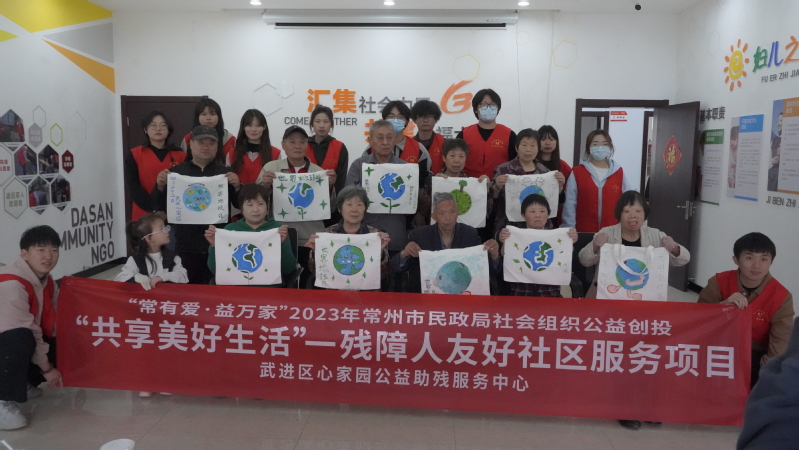 活动开始前,大学生志愿者们向社区居民们宣传了世界地球日的相关知识,向大家介绍了世界地球日的来历、今年“世界地球日”的主题和当前我们的地球面临的严峻形势,让在场的每位居民朋友都能够了解保护地球的重要性,从而引导大家珍惜地球资源,转变发展方式,倡导低碳生活。随后,在大学生志愿者们的协助下,社区老年人、残疾人和小朋友们一起,共同手绘环保帆布包,志愿者们充分发挥自己的专业特长,耐心得指导大家在帆布包上绘制各种充满创意的地球图案,在大家的共同努力下,一幅幅“蓝色星球”作品就呈现在了大家的眼前。本次志愿服务活动所有手绘的帆布包未来将在社区进行义卖,义卖所得的善款都将被用于支持武进心家园公益助残服务中心日常的活动开展。