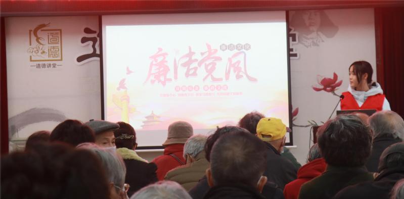 引经论廉,筑廉政之魂。志愿者黄思婷面向社区党员干部开展“廉洁党风”宣传讲座,她从反腐败斗争形势,廉政法律法规和腐败防范措施等方面倡导党员干部增强拒腐防变能力,并带领党员观看教育警示片,以经典案例警醒党员干部,敲响廉洁修身警钟。