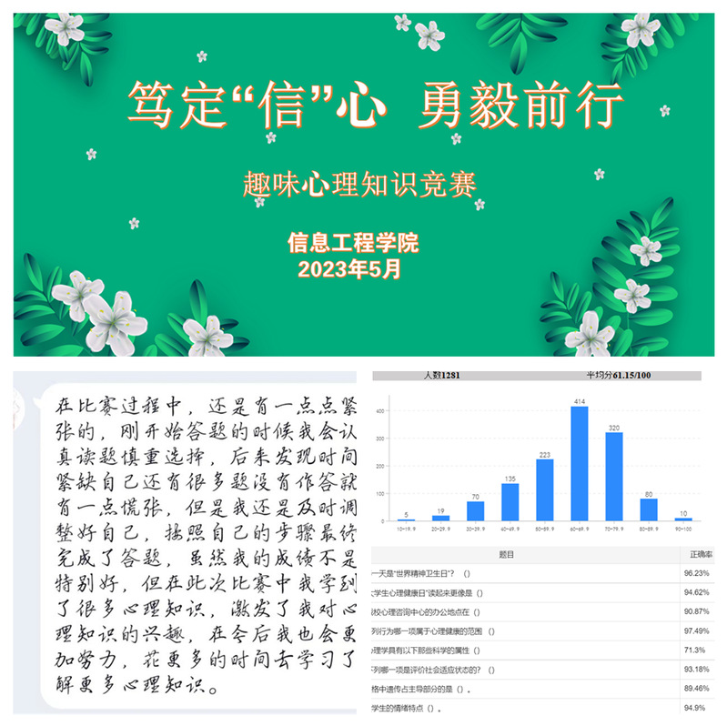 为深入贯彻习近平总书记在党的二十大报告中关于心理健康和精神卫生的重要讲话精神,助力大学生提升心理健康知识水平,培养大学生自尊自信、理性平和、积极向上的社会心态,切实将大学生心理健康教育工作向纵深推进。5月12日,信息工程学院心理辅导站组织全院学生参加“笃定信心 勇毅前行”线上趣味心理健康知识竞赛。
