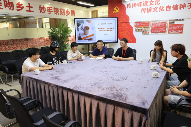为推动学习贯彻习近平新时代中国特色社会主义思想主题教育走深走实,铸牢中华民族共同体意识,推进新时代党的民族工作高质量发展,全面了解学院少数民族学生的学习、生活情况,不断提升少数民族学生教育管理服务水平,6月1日下午,艺术创意学院于敬业楼举办辅导员下午茶之“团结民族心,共筑中国梦”活动。副院长孙军、辅导员肖克、朱益桐及全体21、22级少数民族学生代表参加本次活动,活动由肖克主持。
