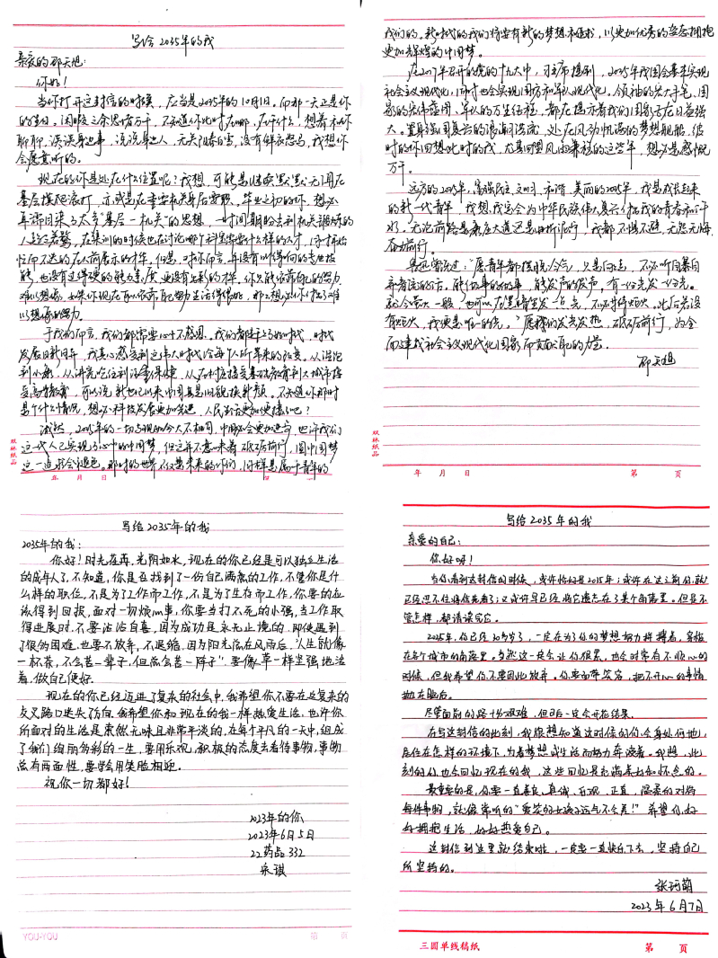 为推动大学生结合所学专业树立正确的学习目标,明确人生方向,规范好未来,引导学生认真领悟党的二十大报告中提出的2035年发展目标和对青年人的寄语,近日,材料工程学院开展了“写给2035年的我”主题征文活动。