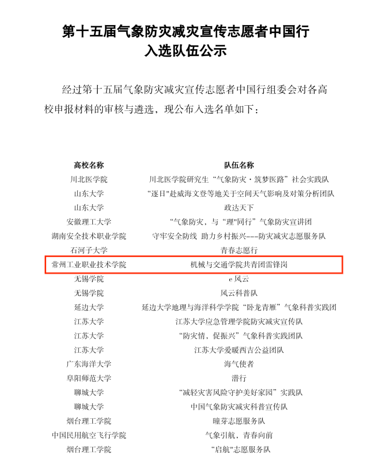 为贯彻落实习近平总书记关于实施乡村振兴战略、防灾减灾和科普工作的重要讲话和指示精神,以服务民生、造福社会为宗旨,共享气象科技发展成果,传播生态文明建设和综合防灾减灾理念,7月,机械与交通学院团委与常州雕庄街道进一步推进结对共建,开展“防灾共建 唱响协同育人旋律的‘大思政课’”暑期社会实践活动,推进气象防灾减灾科普知识进企业、进农村、进社区、进学校、进家庭。本次防灾共建暑期“三下乡”社会实践成功入选2023年全国大学生暑期社会实践“气象防灾减灾宣传志愿者中国行”专项活动。
