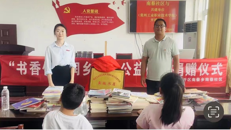 为全面把握全民阅读的重大意义,全面贯彻党的二十大关于建设社会主义文化强国的战略部署和深化全民阅读的重要要求,机械与交通学院团委积极响应校团委“书香传递润乡村”图书捐赠倡议,与南蔡社区结对共建,7月21日上午,在宿迁经开区南蔡乡南蔡社区参加“熹微书屋”揭牌仪式。我校团委副书记苏周媛、机械与交通学院教师陈茜参加本次仪式。