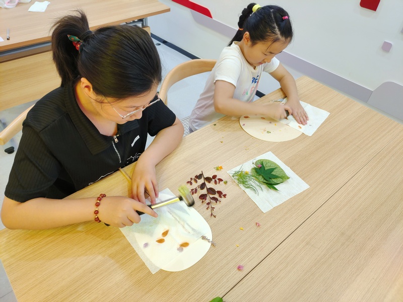 活动现场,孩子们围坐一起,认真倾听着老师讲解非遗文化以及非遗植物拓染制作步骤。小朋友们兴致高涨,积极举手回答问题。在对拓染有了一定的了解后,他们跃跃欲试,在志愿者的指导下开始了拓染的手工体验。活动过程中,孩子们认真挑选自己喜欢的染材,仔细设计排列布局,小心翼翼地用方巾覆盖在染材上,再用橡胶锤、鹅卵石有节奏地敲击。在一阵阵“咚咚咚”的声音中,植物的脉络一点点展现在扇面上。在最后的作品展示环节,小朋友们举着各具特色的拓染扇面,脸上洋溢着喜悦。