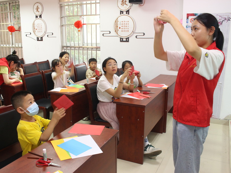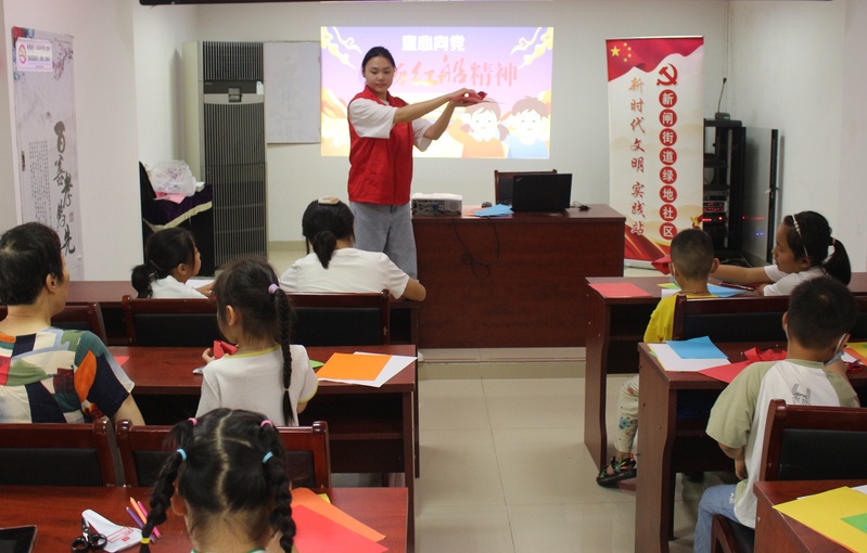 团队走进绿地社区,为小朋友们讲解了“红船精神”的发展由来、具体内涵和历史价值,并带领大家一起制作红船折纸,让“红船精神”和红船文化扎根于青少年心中,让红色基因在孩子们心中落地生根。团队充分借助大学生的专业知识和技能,将课堂搬进社区和乡村,让青年与基层“双向奔赴”。